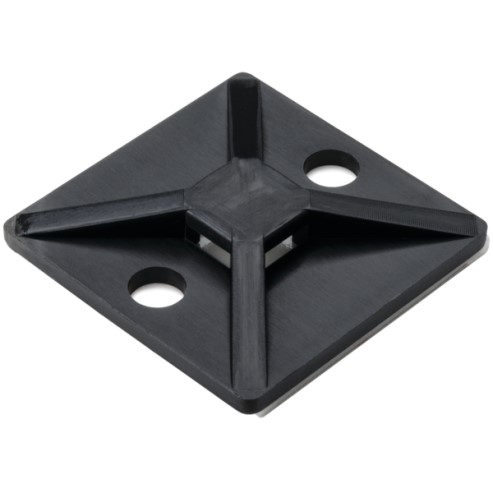 The 151-01632 is a heat bond adhesive base designed to provide a stable mounting point for securing cable bundles. Constructed from black, heat and UV stabilized Polyamide 6.6 (PA66HIRHSUV), this 1.12" x 1.12" mount features a 4-way opening compatible with T18 to T50 series cable ties up to 4.6 mm wide. It utilizes a high-bond acrylic adhesive for secure attachment and includes two predrilled 4.6 mm holes for alternative screw mounting, supporting a static load of up to 11 lbs. With an operating temperature range of -40°C to +105°C and suitability for both indoor and outdoor use, it is a versatile solution for various wire and cable management applications.