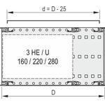 The 24560235 is a stainless steel EMC contact strip used for sealing and electromagnetic compatibility. This gasket measures 416.56 mm in length (84 HP) and is designed to be clipped onto recessed, type VT front or rear horizontal rails. It functions by forming a reliable conductive link between the panel and the rail. This component is essential for maintaining EMC integrity within electronic enclosures by shielding against interference.