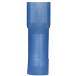The DNF14-188FIB-C vibration resistant female disconnect is made of brass and is tin-plated. It is fully insulated in a blue, nylon housing. It is 0.78" (19.8 mm) long and 0.29" (7.4 mm) wide. The disconnect has a funnel entry barrel configuration and a butted seam barrel.