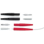 The 6384-0 is a user-installable banana jack for creating custom-length test leads. It is designed for use with stranded wire from 18 to 22 AWG with an insulation diameter of 0.060” to 0.150” and can be attached by either crimping or soldering. This jack is rated for a handheld operating voltage of 300V maximum and a current of up to 15A with 18 AWG wire. Constructed with a nickel-plated brass jack and Santoprene insulation, it operates in temperatures from -29°C to 135°C. When properly assembled, it provides a safe connection compliant with IEC1010 CAT II 300V standards, making it suitable for various test and measurement applications.