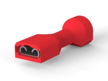 The Ultra-Fast Plus FASTON series fully insulated FASTON Receptacle and Tab offer all the advantages of the standard Ultra-Fast product plus an insulation crimp. The Ultra-Fast Plus fully insulated FASTON receptacles and tabs preclude the need for electrical safety interlocks or special protective shields to help prevent shock hazards. The Ultra-Fast Plus FASTON receptacles and tabs are pre-insulated assemblies featuring a co-moulded housing produced from two different nylon materials. The receptacle/tab and wire barrel portions of the housing are moulded from type 6/6 nylon material with a +130°C UL temperature rating. The insulation barrel is moulded from a premium grade nylon selected to retain the insulation crimp shape. The Ultra-Fast Plus FASTON receptacle housing completely encloses a tin-plated copper alloy. Funnel wire entry Wire stop Assemblies are colour-coded by wire size Assemblies contain wire size and tab size designation Mating tab thickness marked on terminal and visible through housing (110 and 187 series)