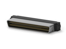 The 5749070-7 is a 50-position 4-row SCSI shielded vertical Receptacle Header with through-hole tail and plain. The Amplimite 0.050 series III receptacle header has gold-plated phosphor bronze contacts, black thermoplastic housing and steel plated bright nickel over copper shells.