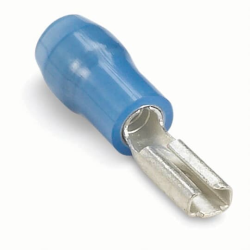 The RA2243 is a nylon-insulated locking fork terminal for wire range #22 - #16 AWG. Locking fork terminals have a specially designed tongue that lets them go on like a fork and stay on like a ring. Length .86 inches, .29 inches width, maximum insulation .136 inches, bolt hole #8. The terminal is high-conductivity electrolytic copper, electro-tin plated, with color-coded insulation. Recommended tool ERG4001.