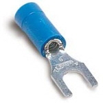 The RC1157 is a vinyl-insulated fork terminal for wire range #12 - #10 AWG. Fork terminals enable easy installation because the mounting screw does not have to be completely removed. Length 1.09 inches, .38 inches width, maximum insulation .210 inches, bolt hole #10. The terminal is high-conductivity electrolytic copper, electro-tin plated, with color-coded insulation. Vinyl-insulated fork terminals have extra-long PVC insulation sleeves for protection and stress relief at the wire’s flex point. Recommended tool ERG4001.